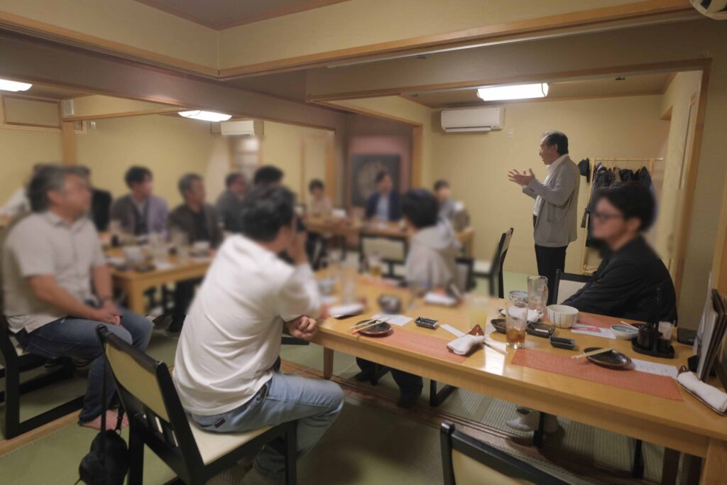 具体的には、お客様とアーケンが家づくりの契約をさせていただいた後、着工前に、その家づくりに関わる設計者、施工管理者、大工さん、そして基礎、断熱、電気、クロス、仮設、設備工事など関連する業種の職人さんたちをお招きして食事会を開催するのです。